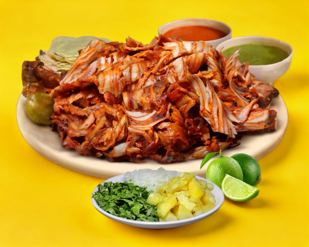 1 kilo de carne al pastor acompañado de 10 tortillas de maíz dobles, 5 tortillas de pan arabe,2 pan cemita, cebolla, cilantro, piña con salsas a elegir
