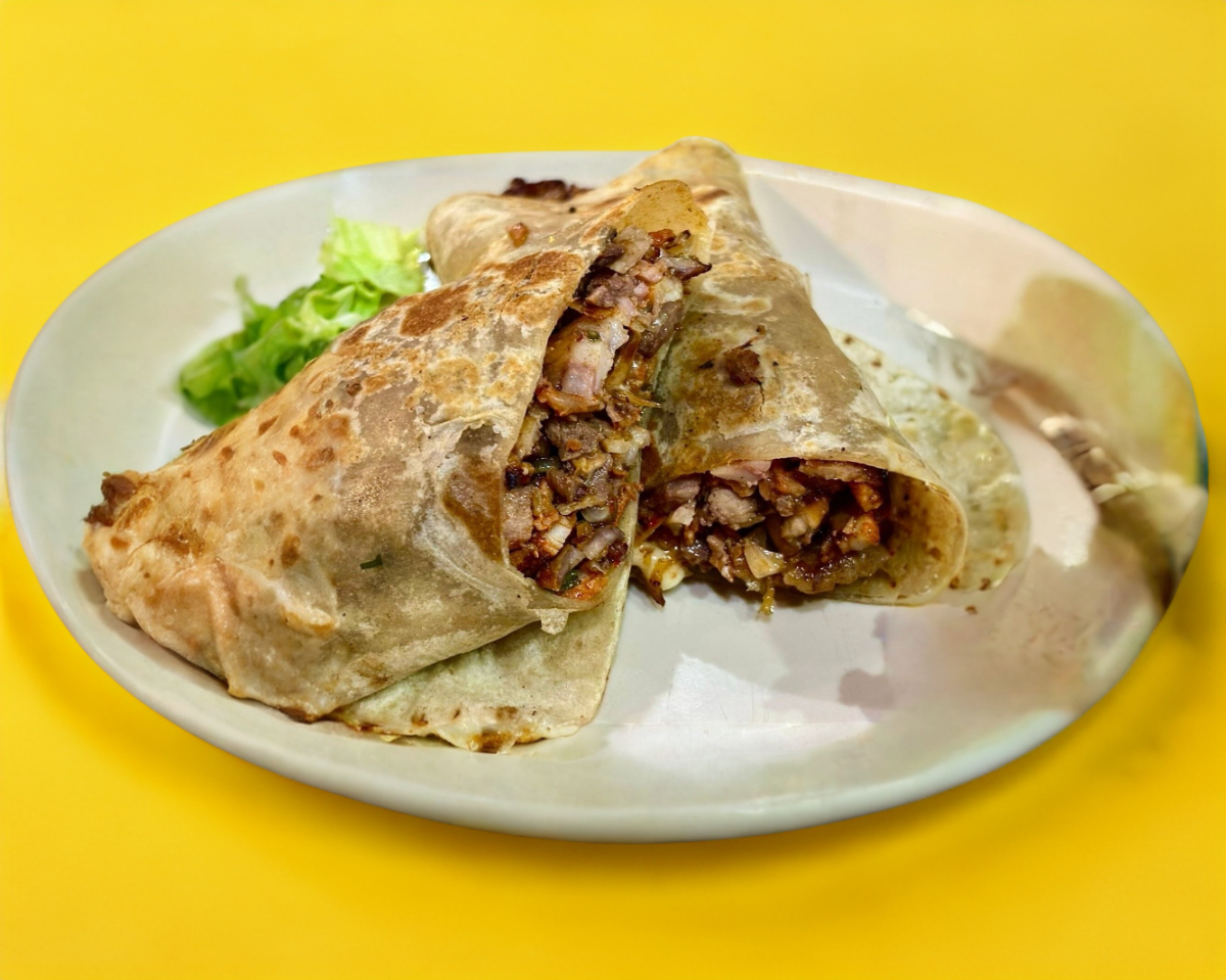 Tortilla de harina de 30 cm con frijoles refritos, carne de sirloin y queso gratinado, acompañado de una pequeña ensalada y guacamole con salsas a elegir.
