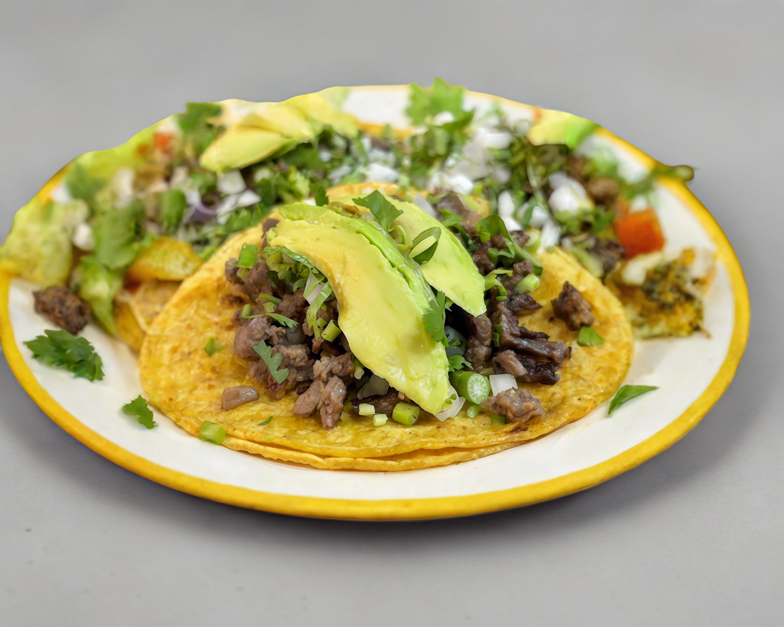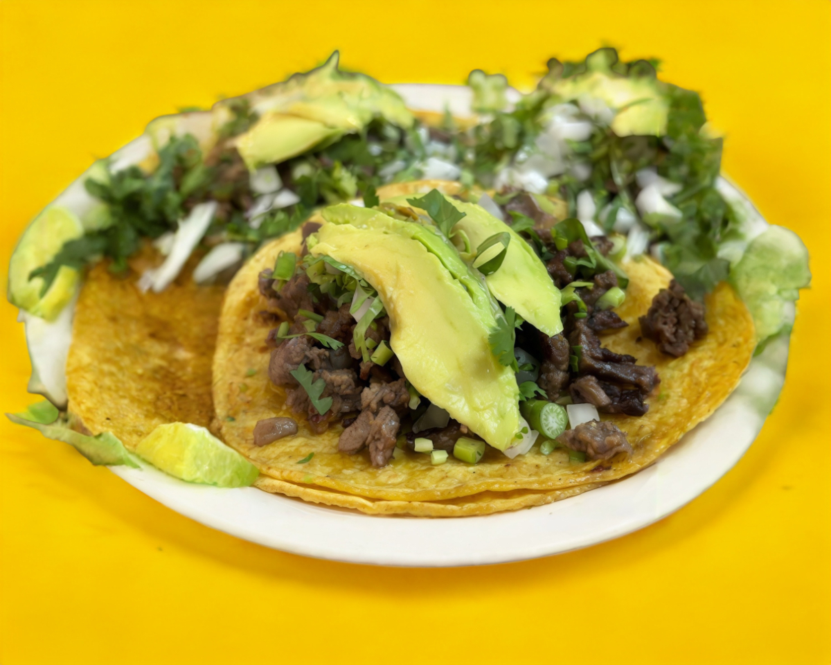 Deliciosa carne de arrachera sobre tortilla de maiz doble, acompañada de cebolla, cilantro, aguacate y salsas a elegir