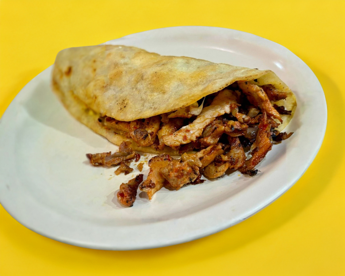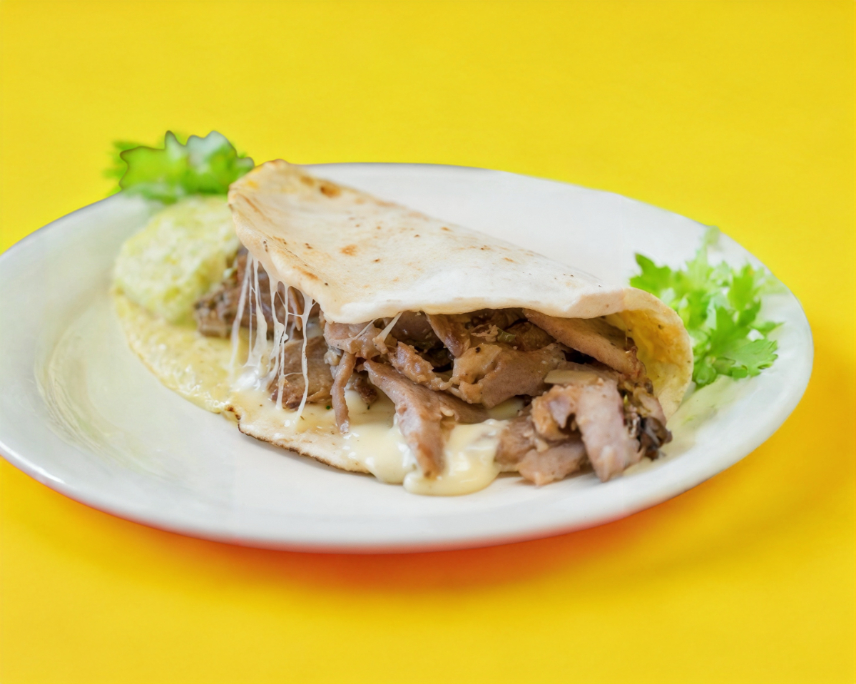 Contiene dos tortillas de pan árabe: una sirve como base en la cual se coloca carne de bistec de cerdo con queso gratinado, la segunda tortilla de pan árabe se coloca encima y salsas a elegir.