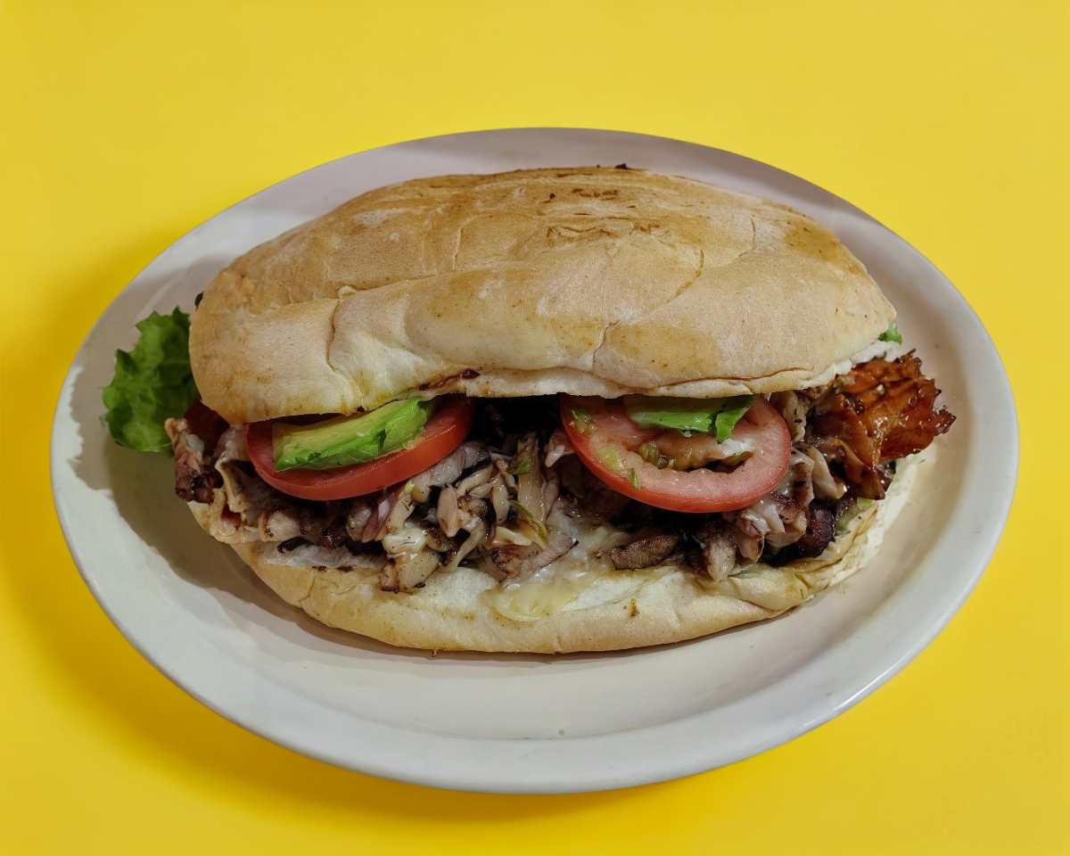 Tradicional pan de cemita, relleno de carne al pastor, quesillo, aguacate, cebolla, pápalo y chile chipotle y salsas a elegir