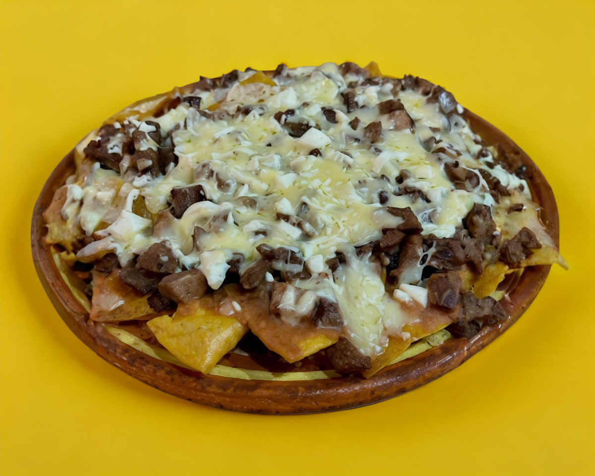 Deliciosos nachos con totopos de tortilla de maiz y carne de arrachera bañados con frijoles refritos y queso gratinado.