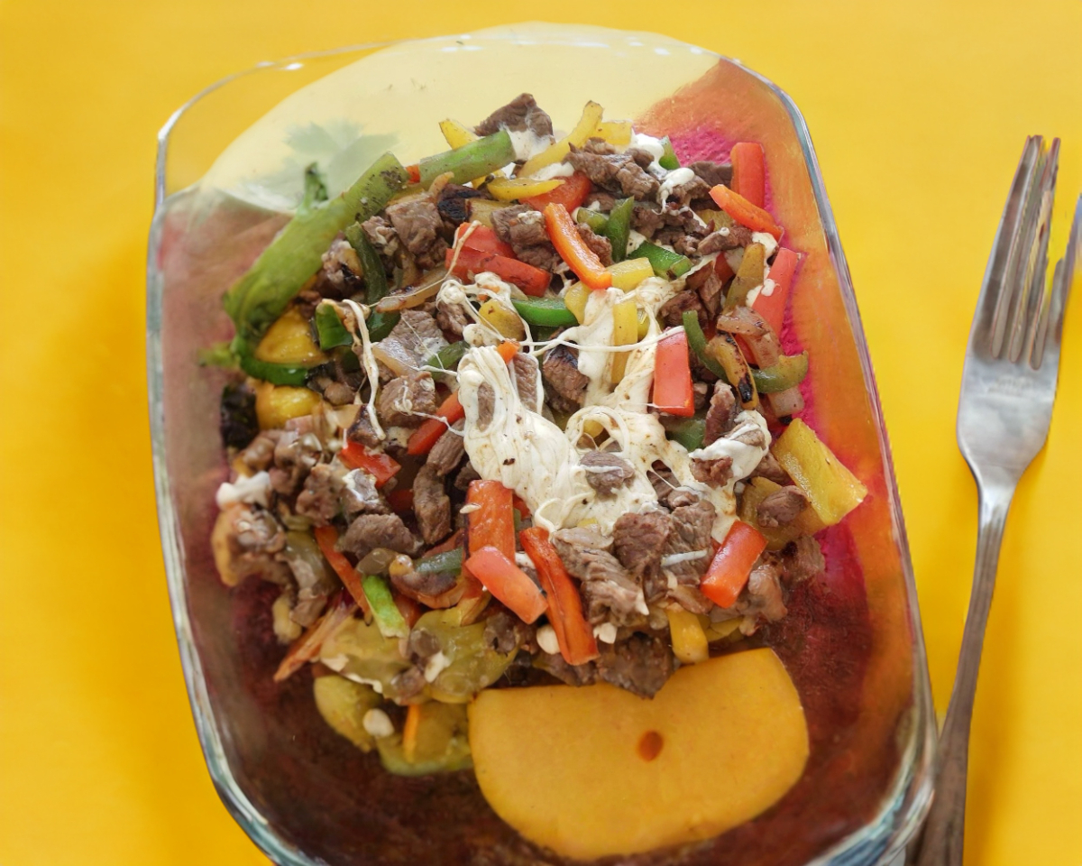 Deliciosa carne de sirloin con queso gratinado sobre pan árabe y salsas a elegir.