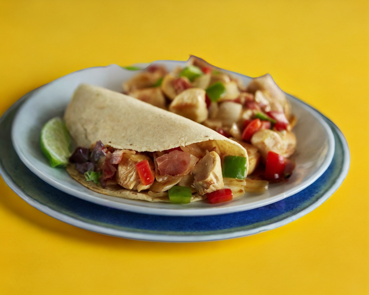 Carne al pollo acompañado de pimientos (verde, amarillo y rojo), cebolla y queso gratinado, incluye 5 tortillas dobles de maíz y salsas a elegir