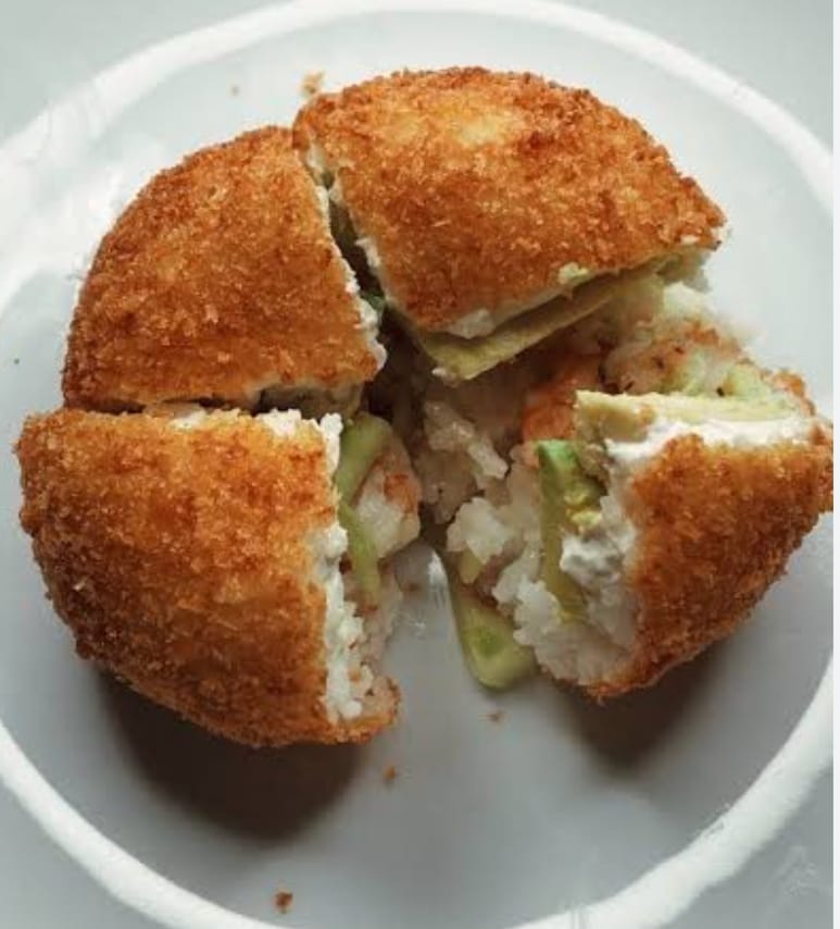 Bola de arroz de 160 g rellena de aguacate, queso derretido y empanizada.