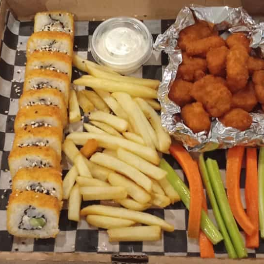 Incluye: sushi empanizado camarón, papas, 6 boneless, ranch y bastones de zanahoria y apio.