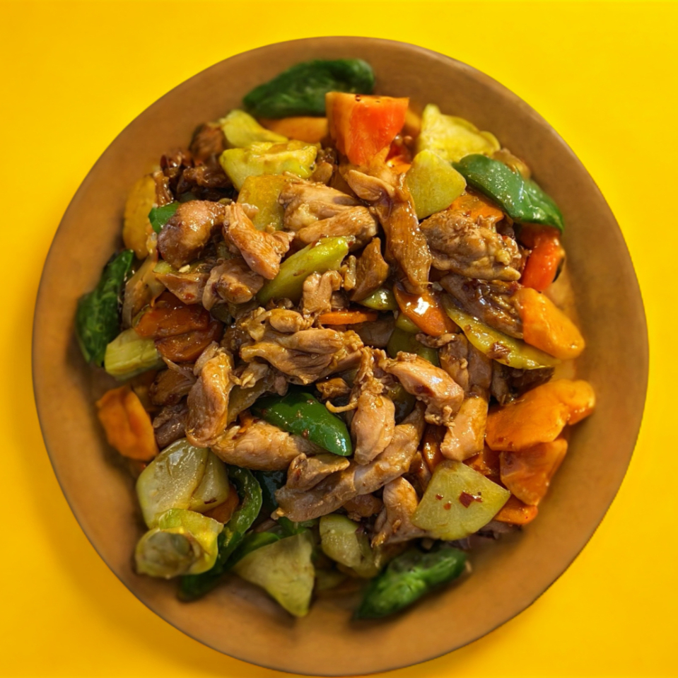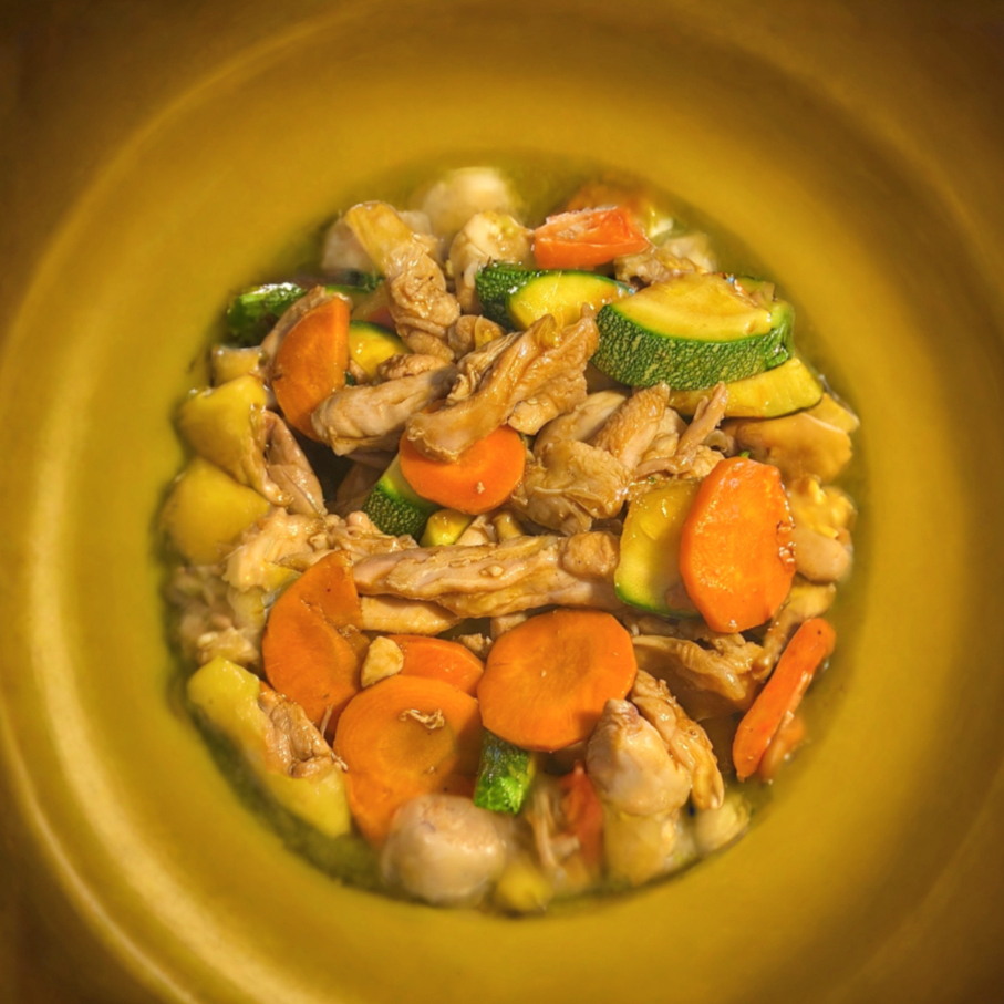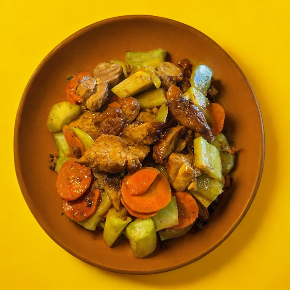 Pollo salteado con chayote, zanahoria y Chile jalapeño.