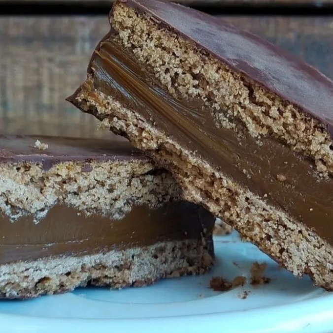 Alfajor bañado de chocolate amargo, relleno de dulce de leche.