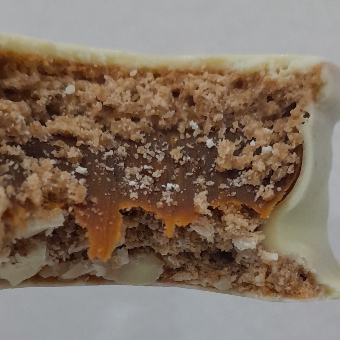 Alfajor bañado en chocolate blanco, relleno de dulce de leche.