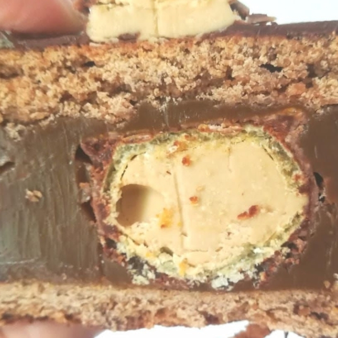 Alfajor bañado en chocolate con leche y cacahuate, relleno de dulce de leche.