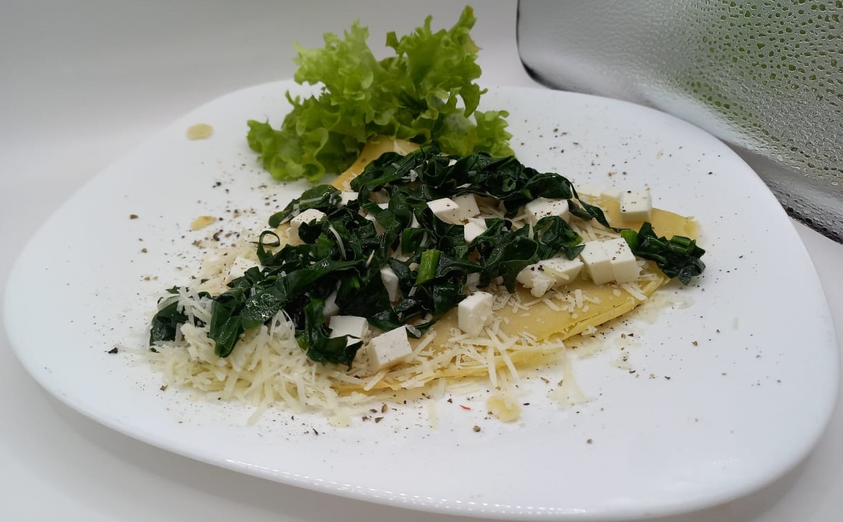 Crepa Rellena de Salmon, espinaca, queso de cabra y salsa bechamella
