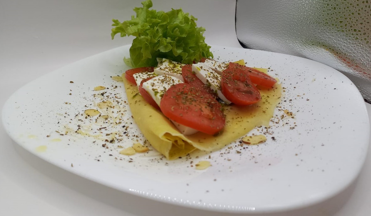 Crepa rellena de rebanada de jitomate, mozzarella y pesto de albahaca.