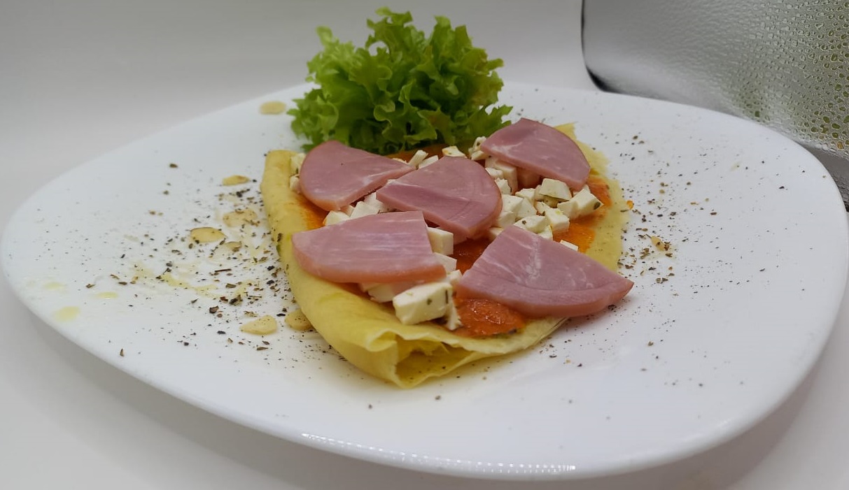 Crepa rellena de salsa de tomate casera, mozzarella, oregano y jamon.
