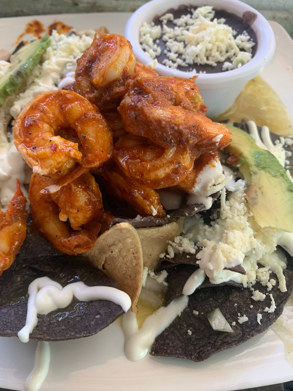 Totopo frito bañado en salsa de tu elección acompañada de especias, queso y Camarón