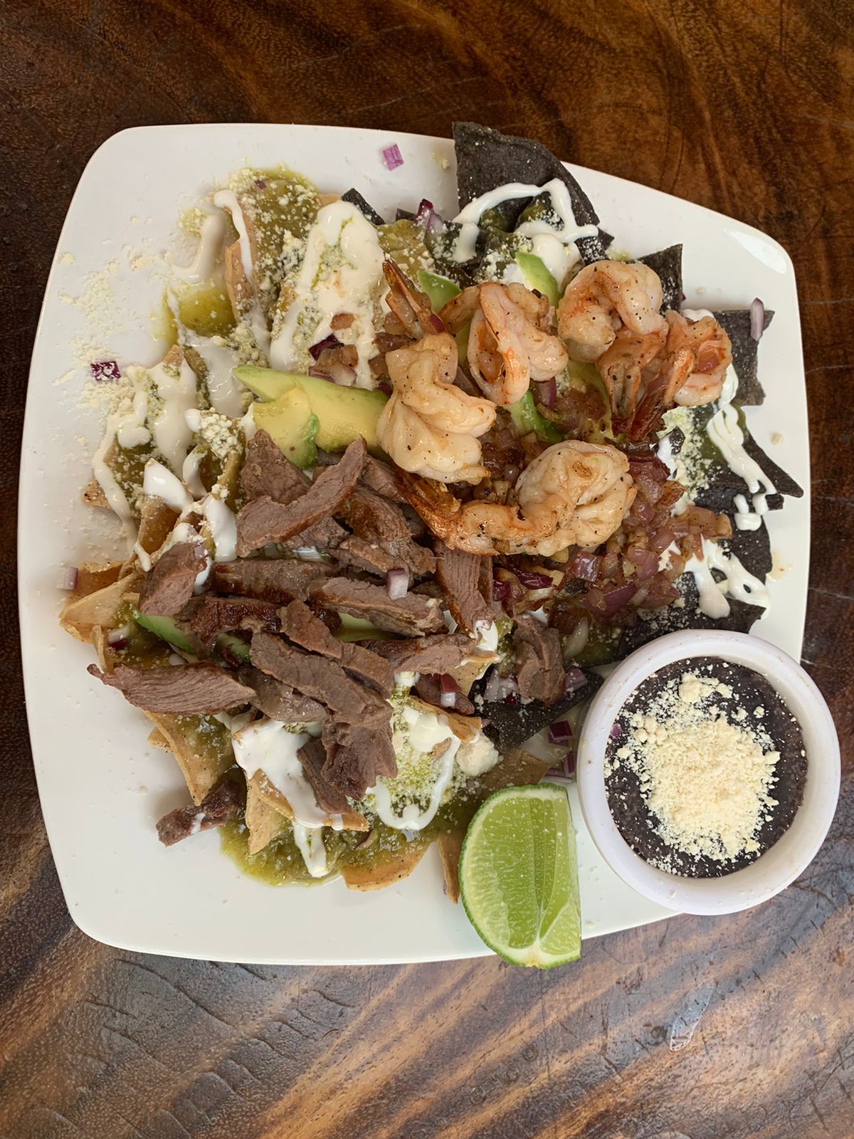 Totopo frito bañado en salsa de tu elección acompañada de especias, queso, camarones y arrachera