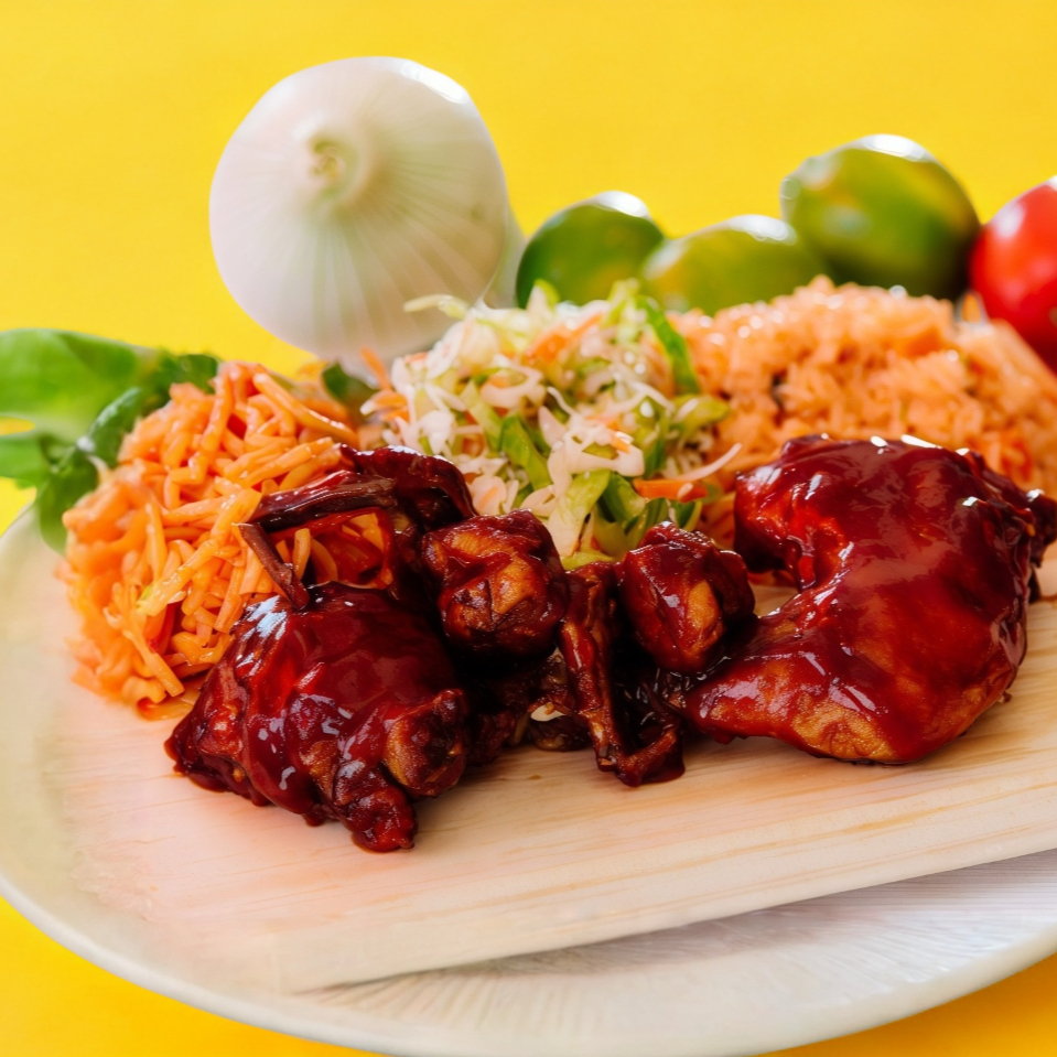 1 pierna con muslo, 1 costilla y 1 alita bañada con una salsa de tamarindo picosita y acompañada de 2 guarniciones, incluye romanita y salsa picante.
