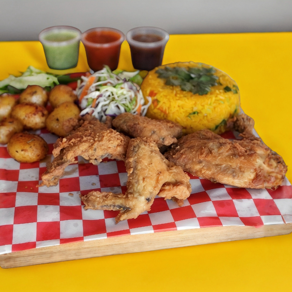 2 alitas y 1/2 pechuga crujiente (pieza completa, no fileteada), acompañadas de 2 guarniciones. incluye ensalada, salsa picante y tortillas.