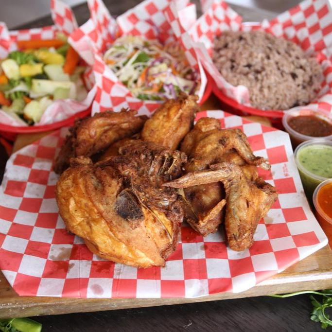 3 piernas y 3 muslos frita, acompañada de 2 guarniciones, incluye romanita y salsa.