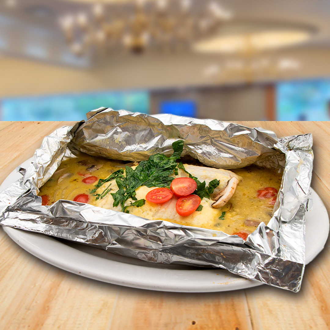 Filete de pescado cocido en su propio jugo con vegetales frescos y especias, envuelto en papel aluminio para conservar todo su sabor y suavidad. Ligero y lleno de aroma.