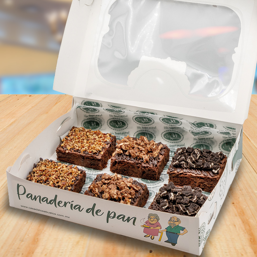 Caja de brownies surtidos: esponjosos, intensos de chocolate y con toppings crujientes. Perfectos para compartir o darte un antojo. Pídelos hoy mismo.