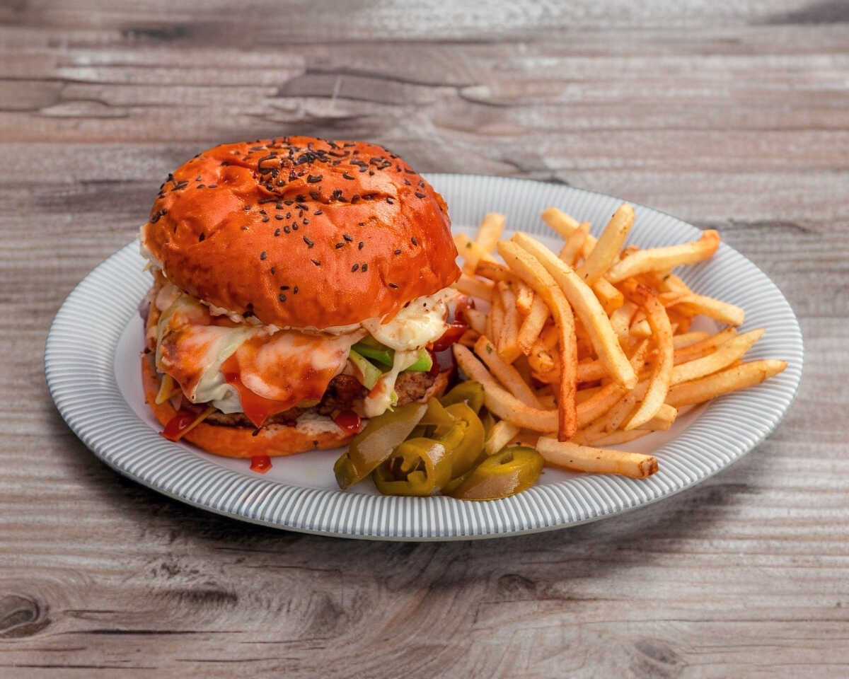Pan brioche, 270gr de carne 100% casera, bañada con salsa BBQ, queso gratinado, lechuga, jitomate, cebolla caramelizada, pepinillos, mayonesa, catsup y mostaza.