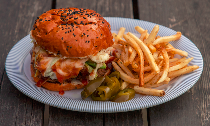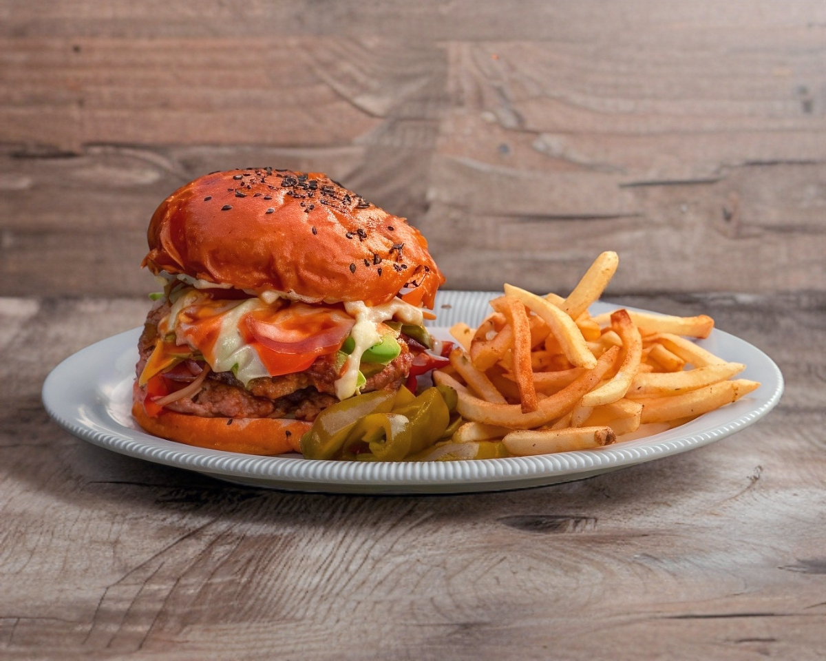 Pan brioche con 135gr de carne, queso oaxaca fundido, tocino,1 huevo estrellado, lechuga, cebolla caramelizada, jitomate, pepinillos, mostaza, catsup, mayonesa.