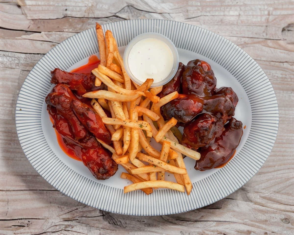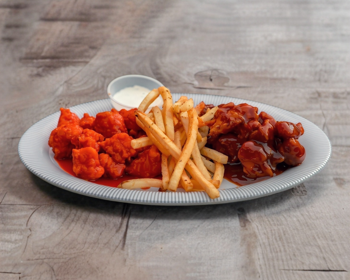 Ricos boneless hechos 100% de pechuga de pollo, bañados en deliciosa salsa a elegir, acompañados de papas a la francesa.