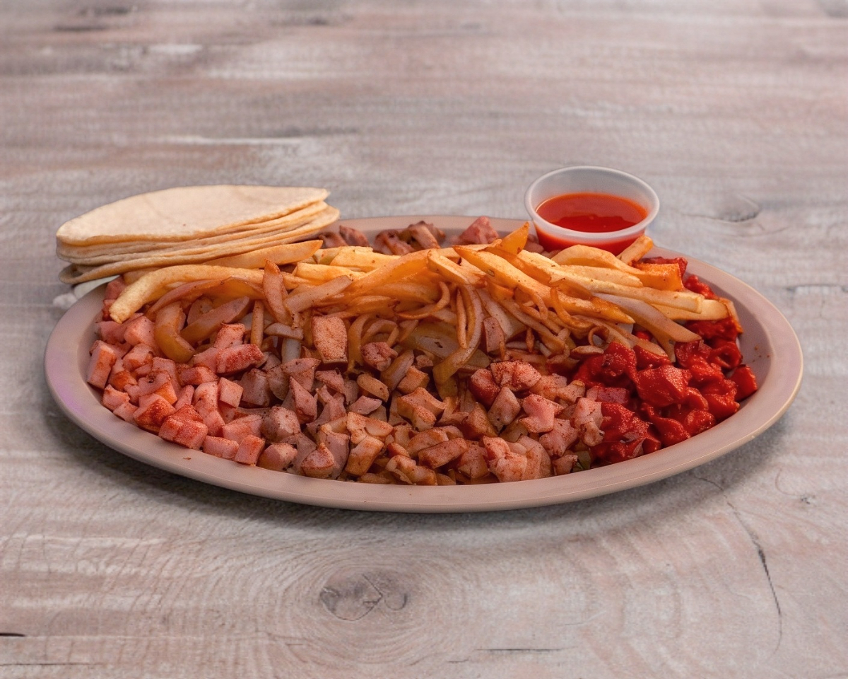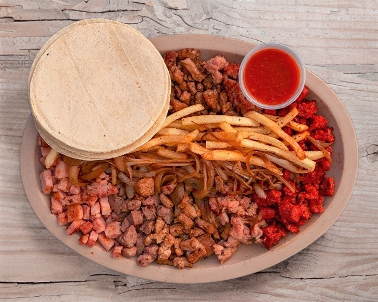 Bistec 100gr, chuleta 100gr, chorizo español 100gr, chorizo argentino 100gr, arrachera 100gr. Acompañada con cebolla caramelizada y papas a la francesa, incluye orden de tortillas de maíz.