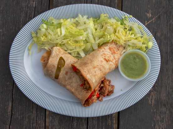 Tortilla de harina jumbo para burrito, chili de la Casa, chile morrón, carne y lechuga.