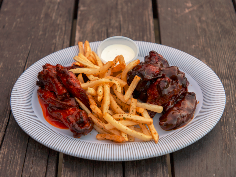 Ricas alitas marinadas en salsa especial, bañadas en deliciosa salsa a elegir, acompañadas de papas a la francesa.