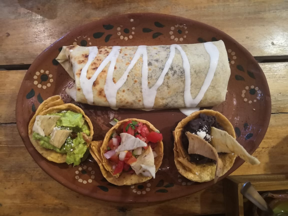 Burrito relleno a elección, pimiento morrón, cebolla, frijol y queso manchego.