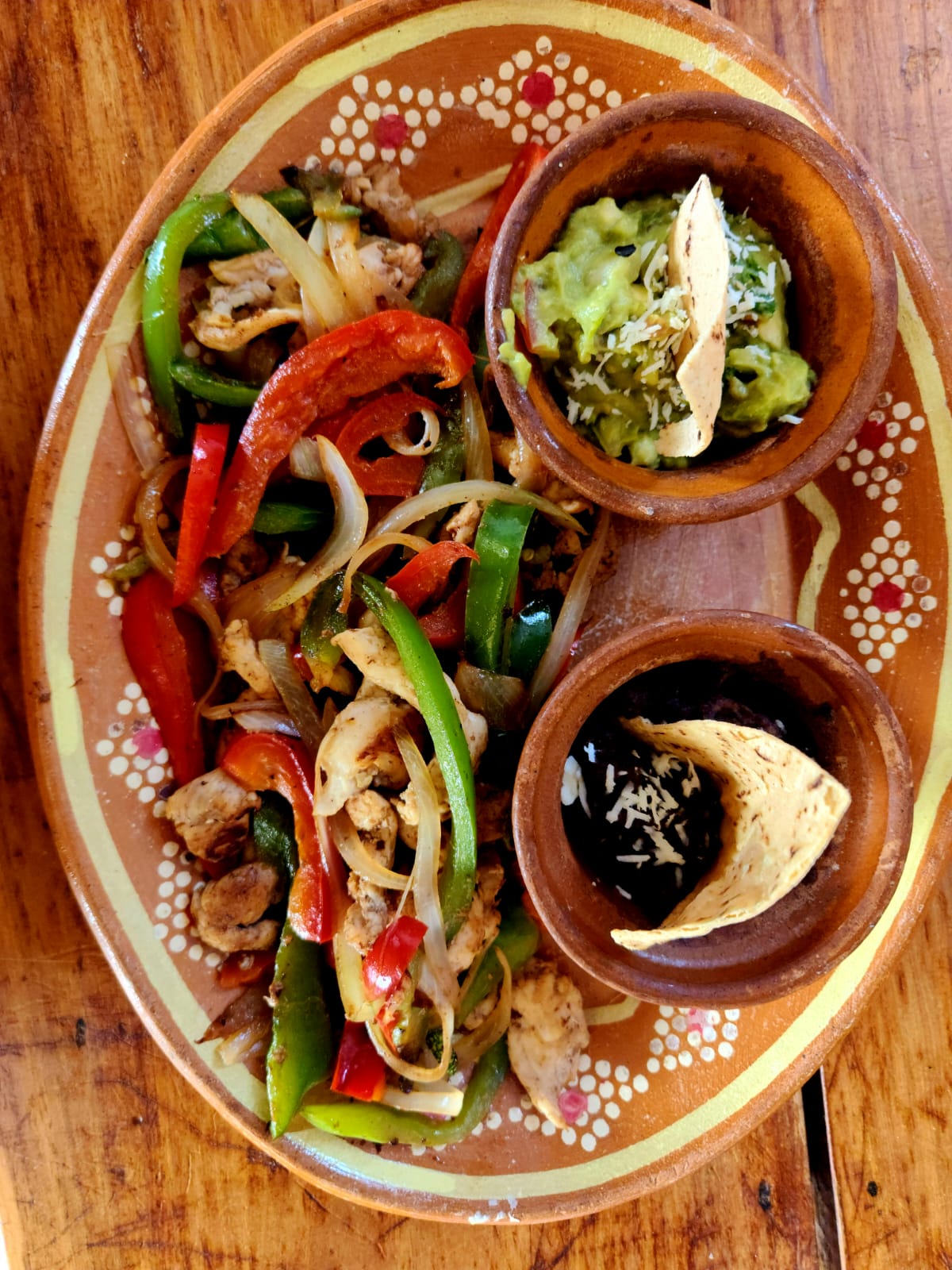 Fajita de res o pollo a elección a la plancha con cebolla y pimiento morrón, frijoles y guacamole.