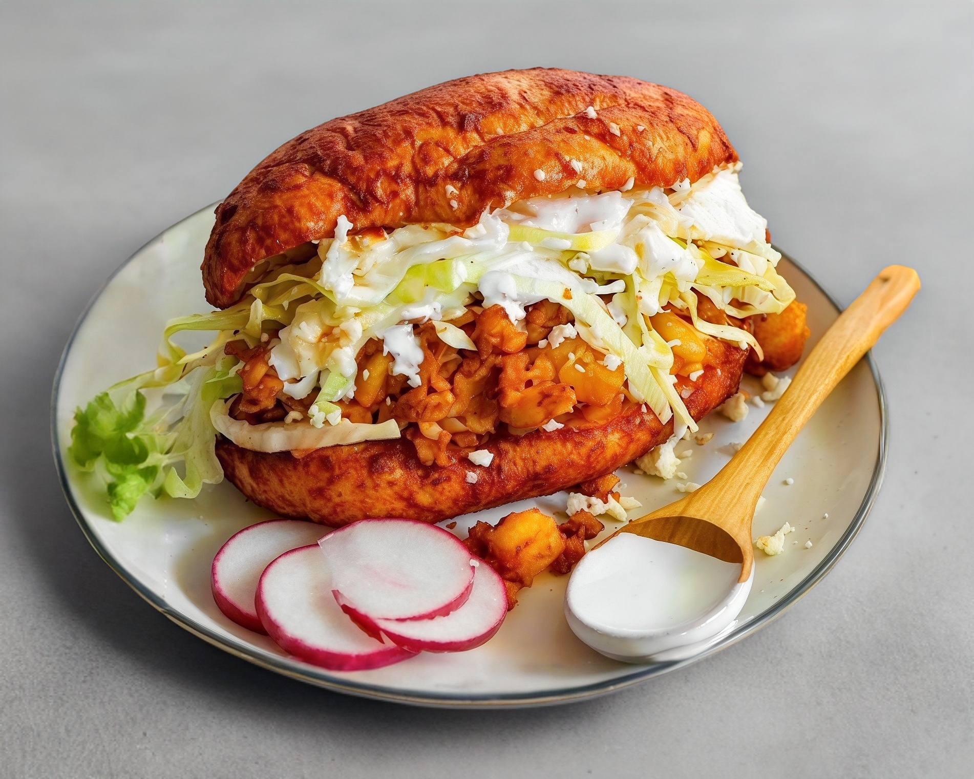 Relleno de papa con longaniza,lechuga,crema y queso.