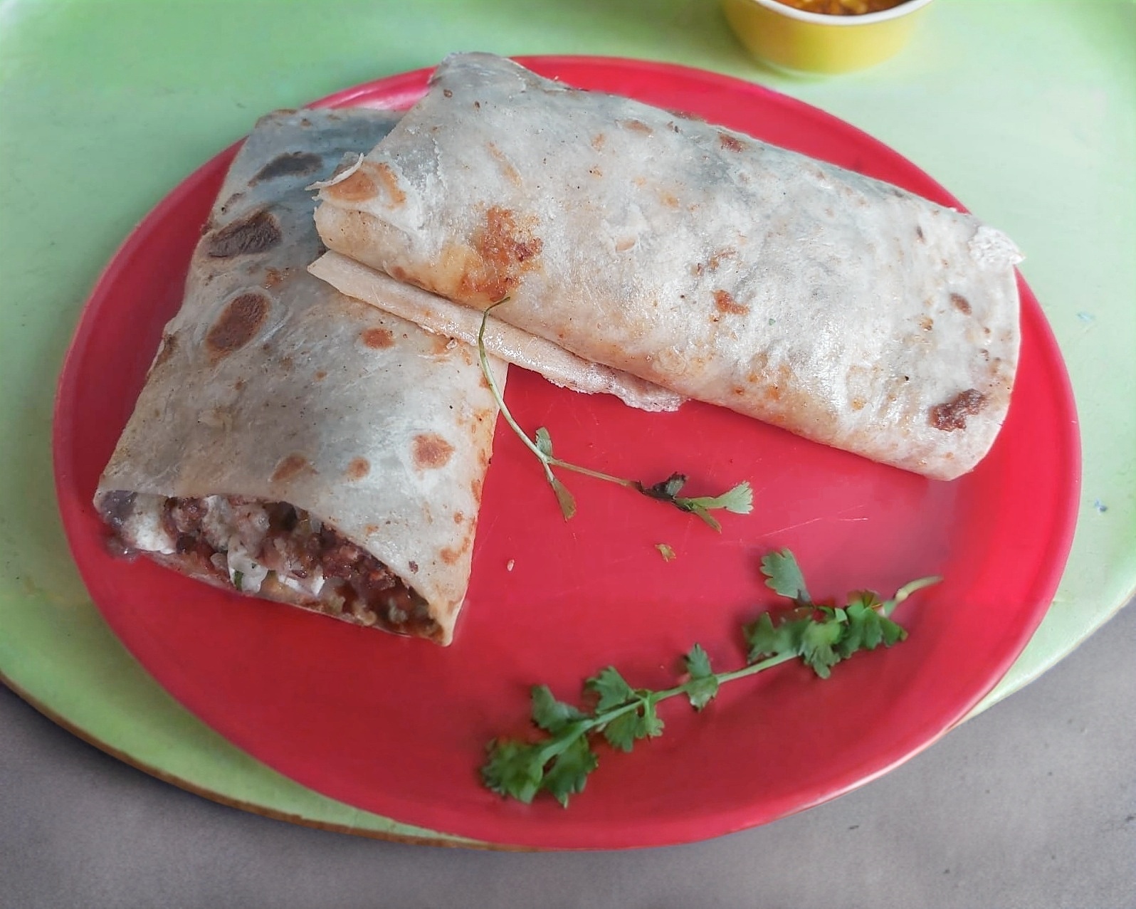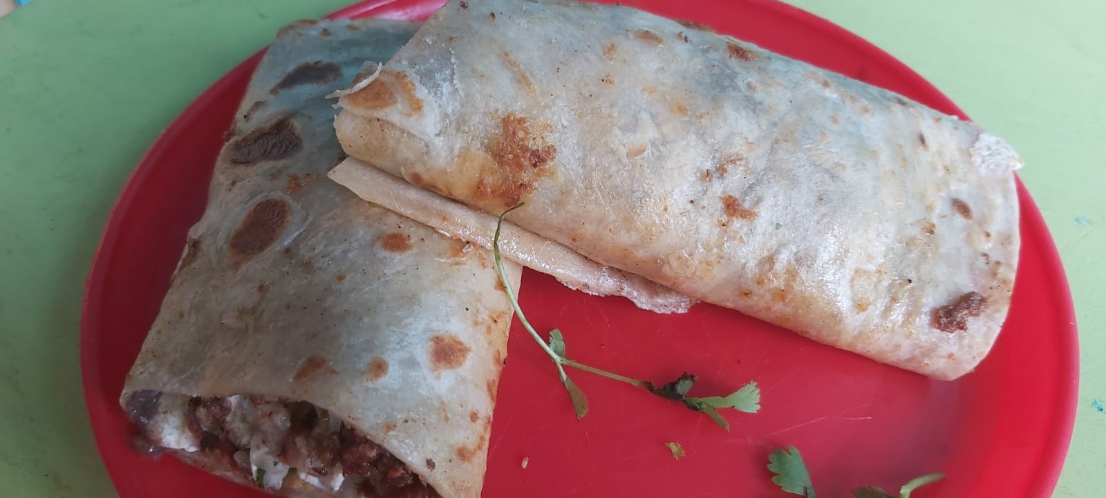 Con tortilla de harina, frijol, cilantro, cebolla, lechuga y queso Oaxaca