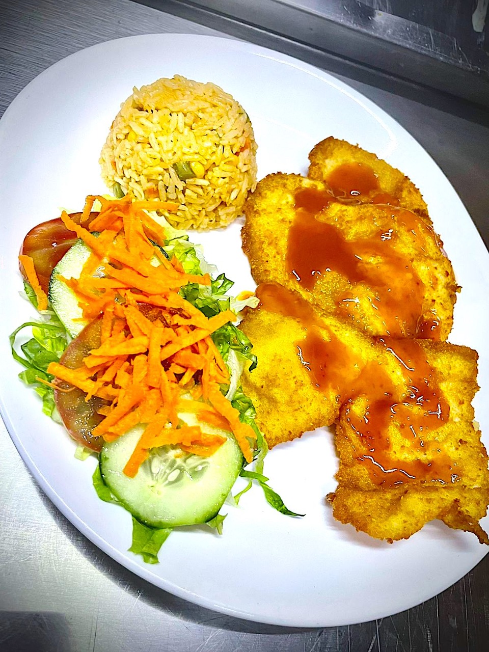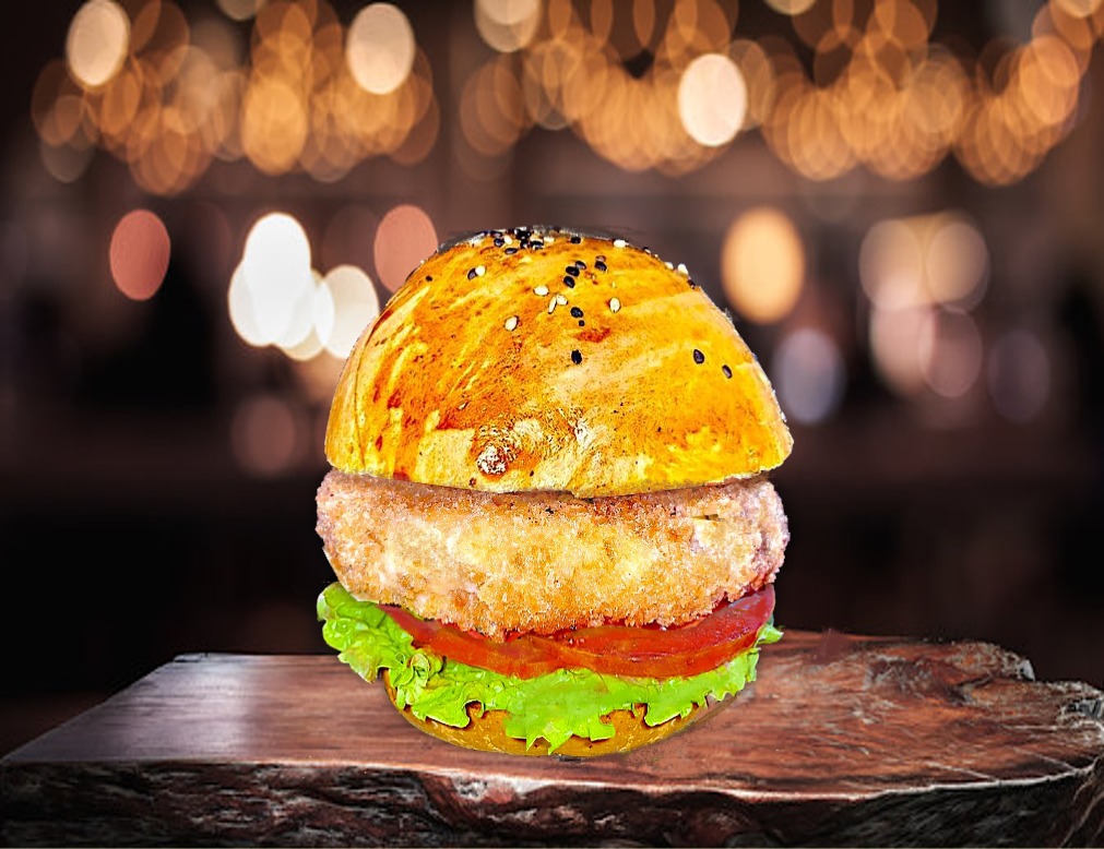 Milanesa empanizada hecha con garbanzo, trilogía de quinoas y camote. acompañada con: aguacate machacado, aderezo de curry rojo, lechuga, jitomate y guarnición de su elección.