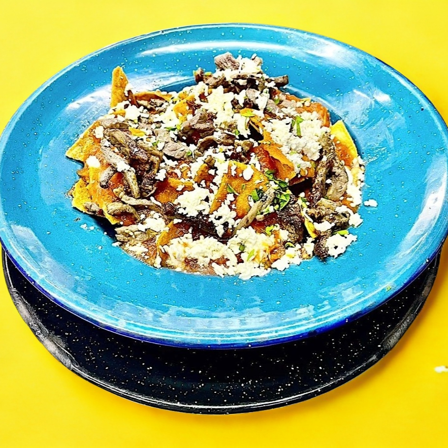 Chilaquiles de maíz con salsa y proteína de su elección y queso panela rallado.