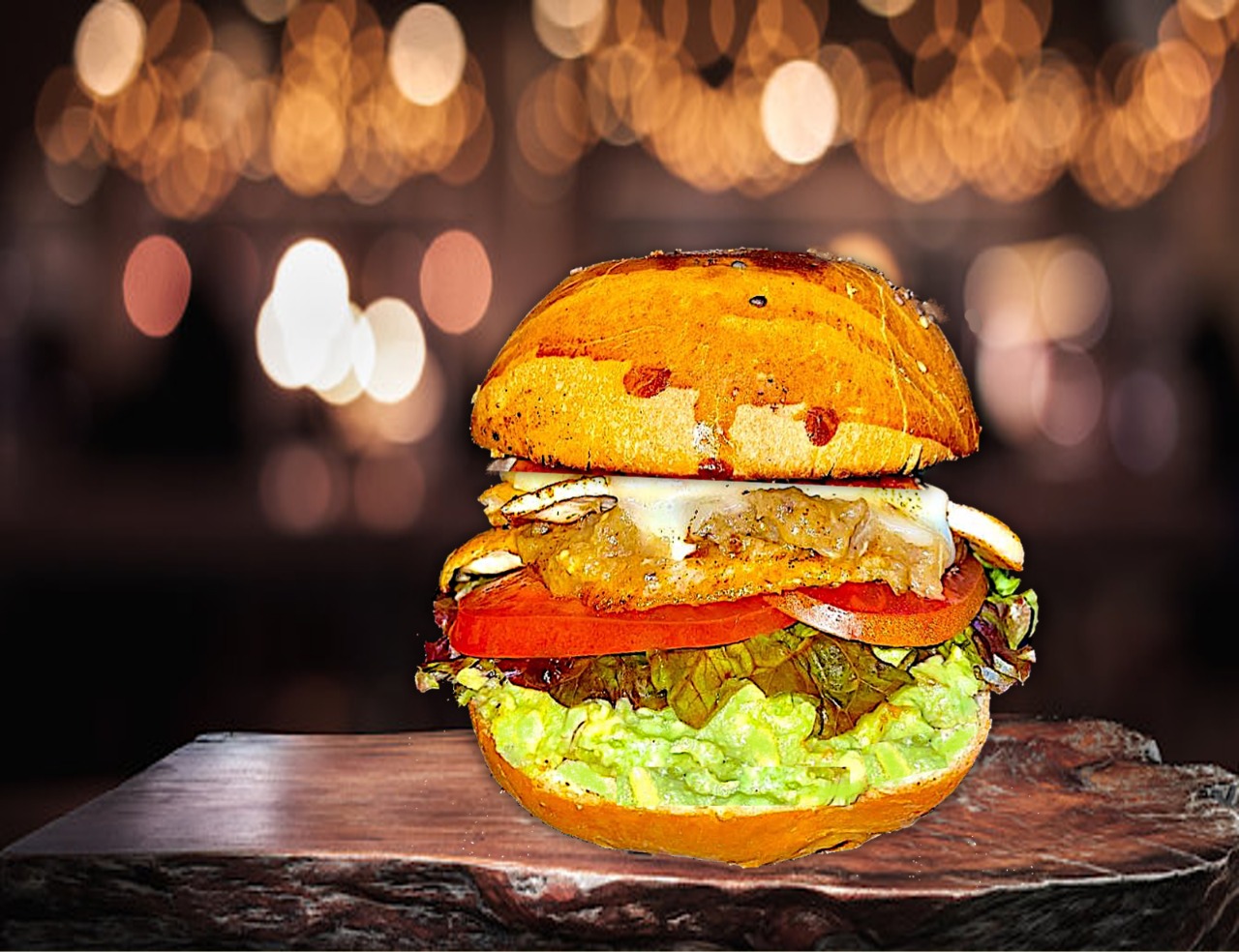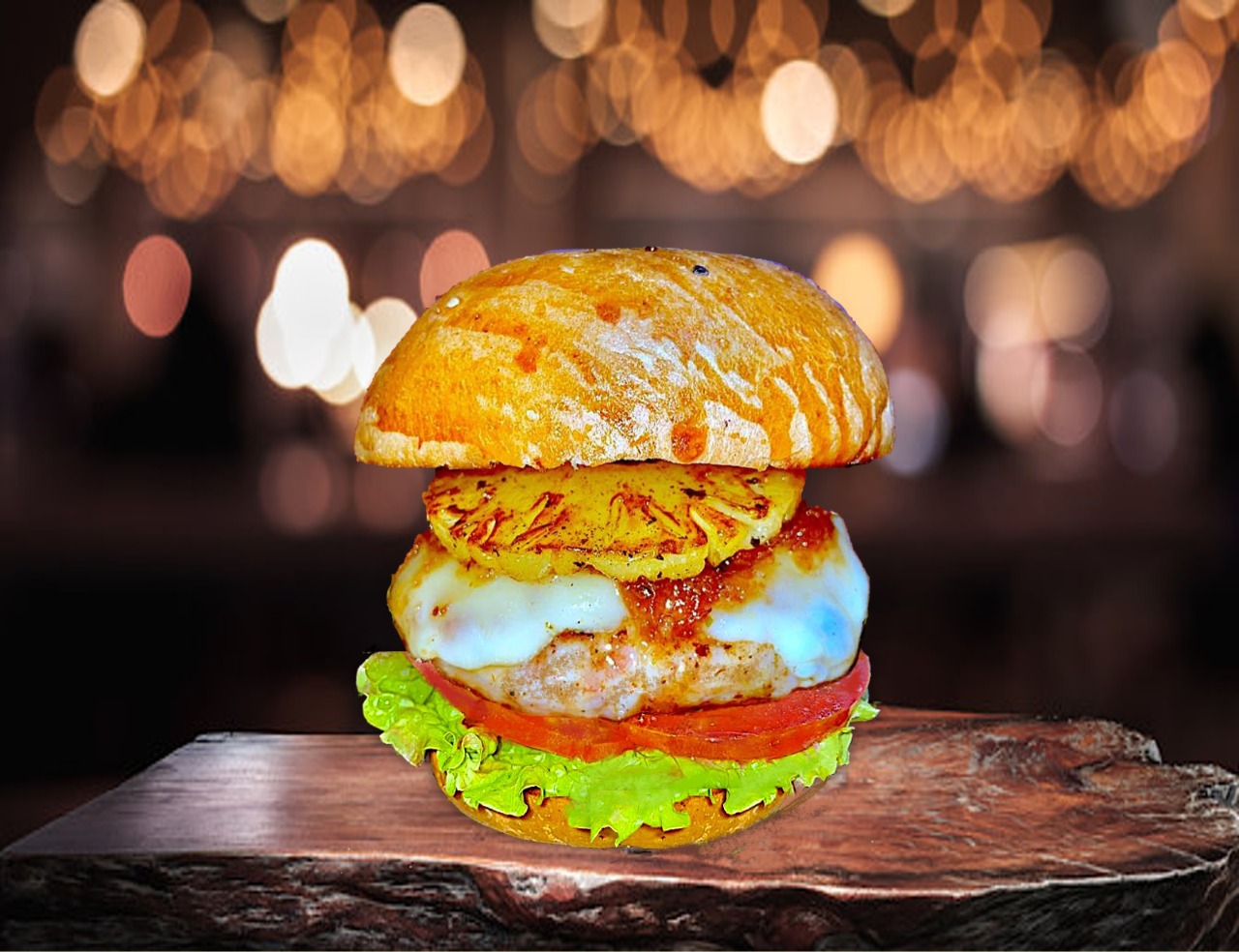 Pechuga de pollo molida, piña parrillada, queso manchego, tocino ahumado, chimichurri, aguacate, lechuga, jitomate y guarnición de su elección.