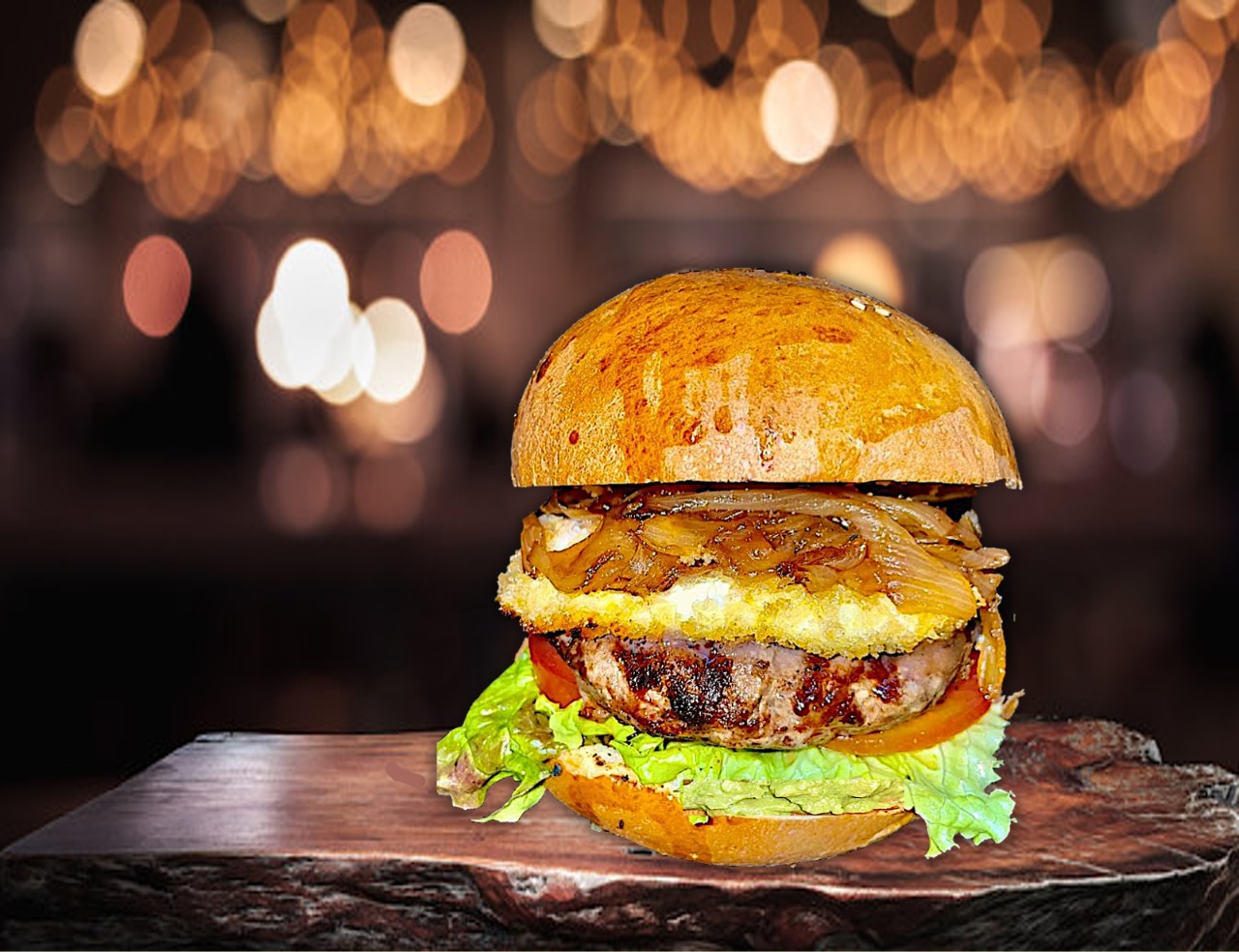 Carne de res usda choice, croqueta de queso de cabra empanizado, compota de pera e higo, cebolla caramelizada, lechuga, jitomate y guarnición de su eleccion.