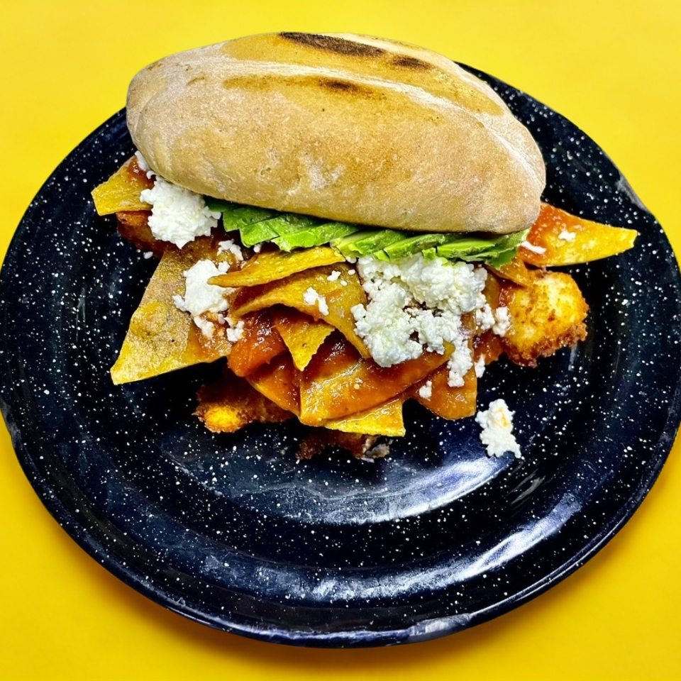 Torta con milanesa de pollo, chilaquiles al gusto, queso panela y aguacate.