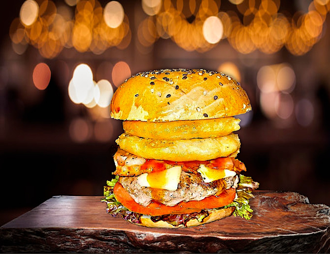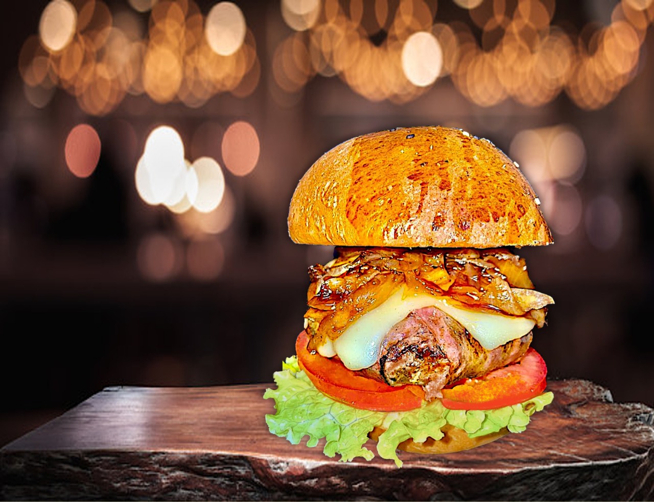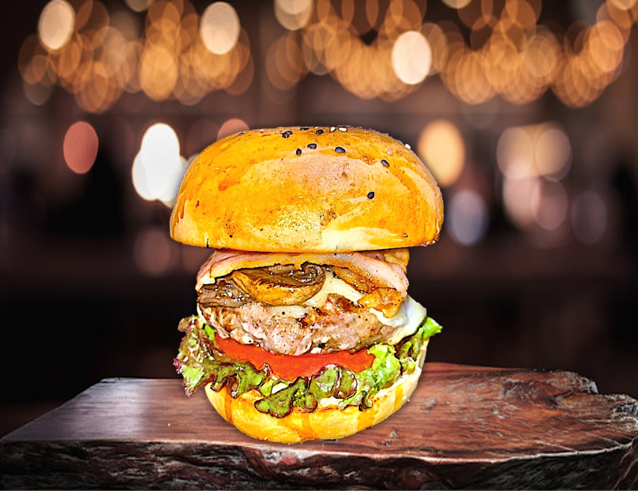 Carne de res, queso gouda gratinado, tocino ahumado, champiñones salteados. Servidas con lechuga y jitomate, incluye papas, camote, elote ó aros.