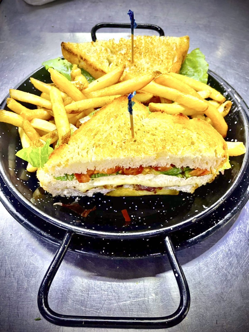 Con jamón, queso gouda, tocino, pechuga de pollo, mayonesa, lechuga y jitomate. Incluye papas.