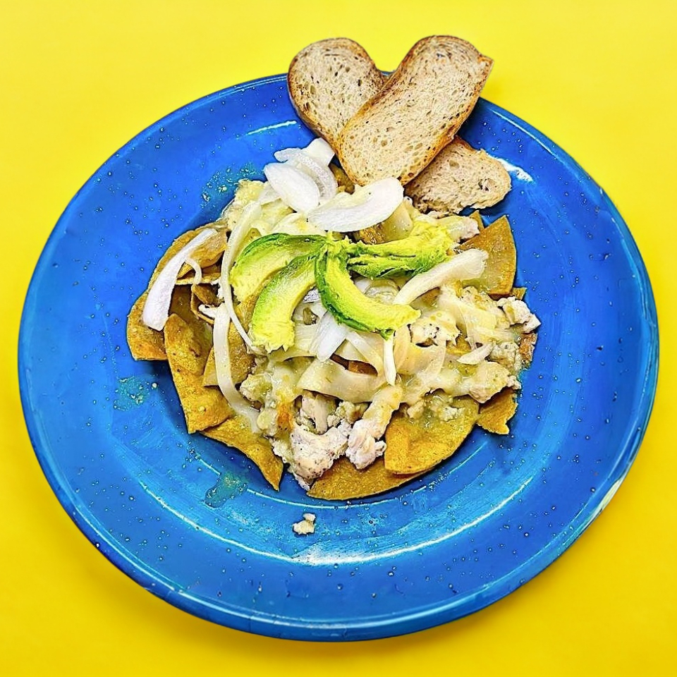 Chilaquiles en salsa verde cremosa con pechuga asada y queso gouda al gratín. servido con rebanadas de aguacate, cebolla y pan campesino de la casa.
