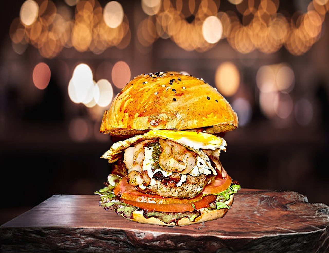 Carne de res, queso Oaxaca parrillado, huevo frito, tocino ahumado, chimichurri. Servidas con lechuga y jitomate, incluye papas, camote, elote ó aros.
