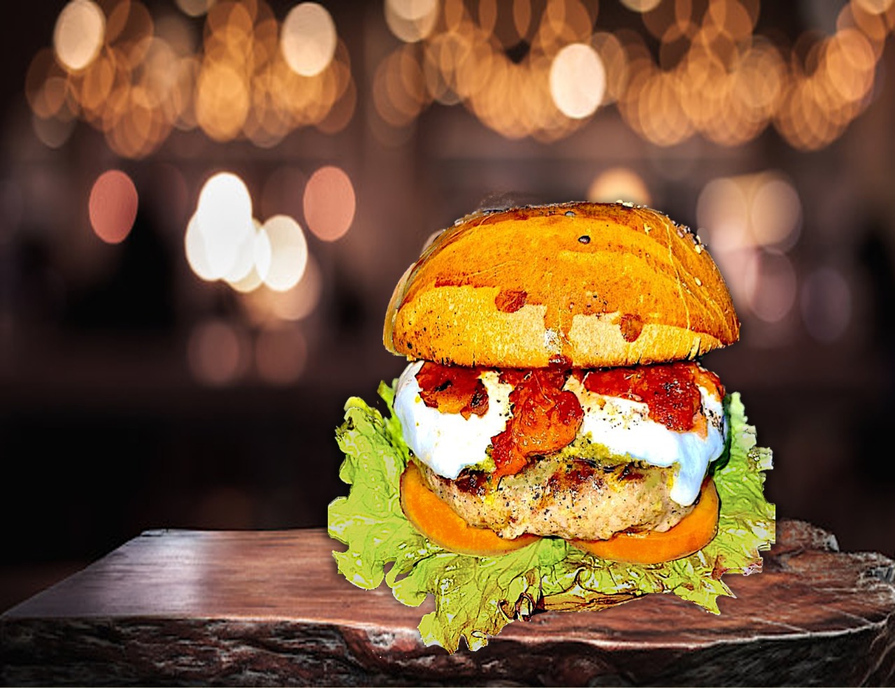 Carne de res, mozzarella fresco, chili flakes, jitomate rostizado con glaze balsámico y ajo. Servidas con lechuga y jitomate, incluye papas, camote, elote ó aros.