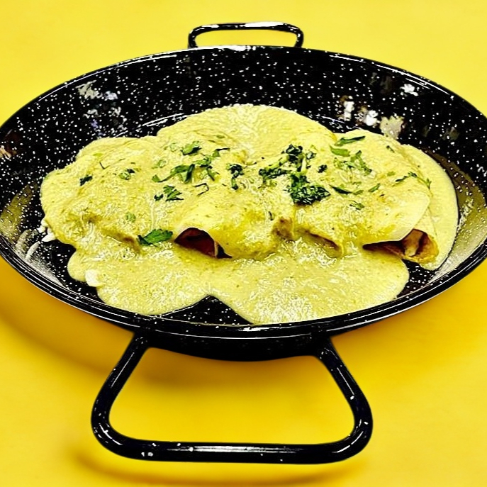 3 Enchiladas de maíz rellenas de pollo con salsa suiza cubiertas con queso suizo gratinado