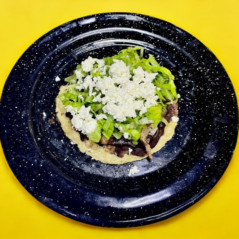 Sope de maíz con proteína a elegir, lechuga, frijol negro y queso panela.