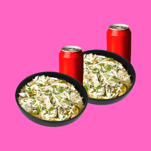 2 Chilaquiles con crema, queso, cebolla, cilantro y 2 Coca-Cola 355 ml (a elección).