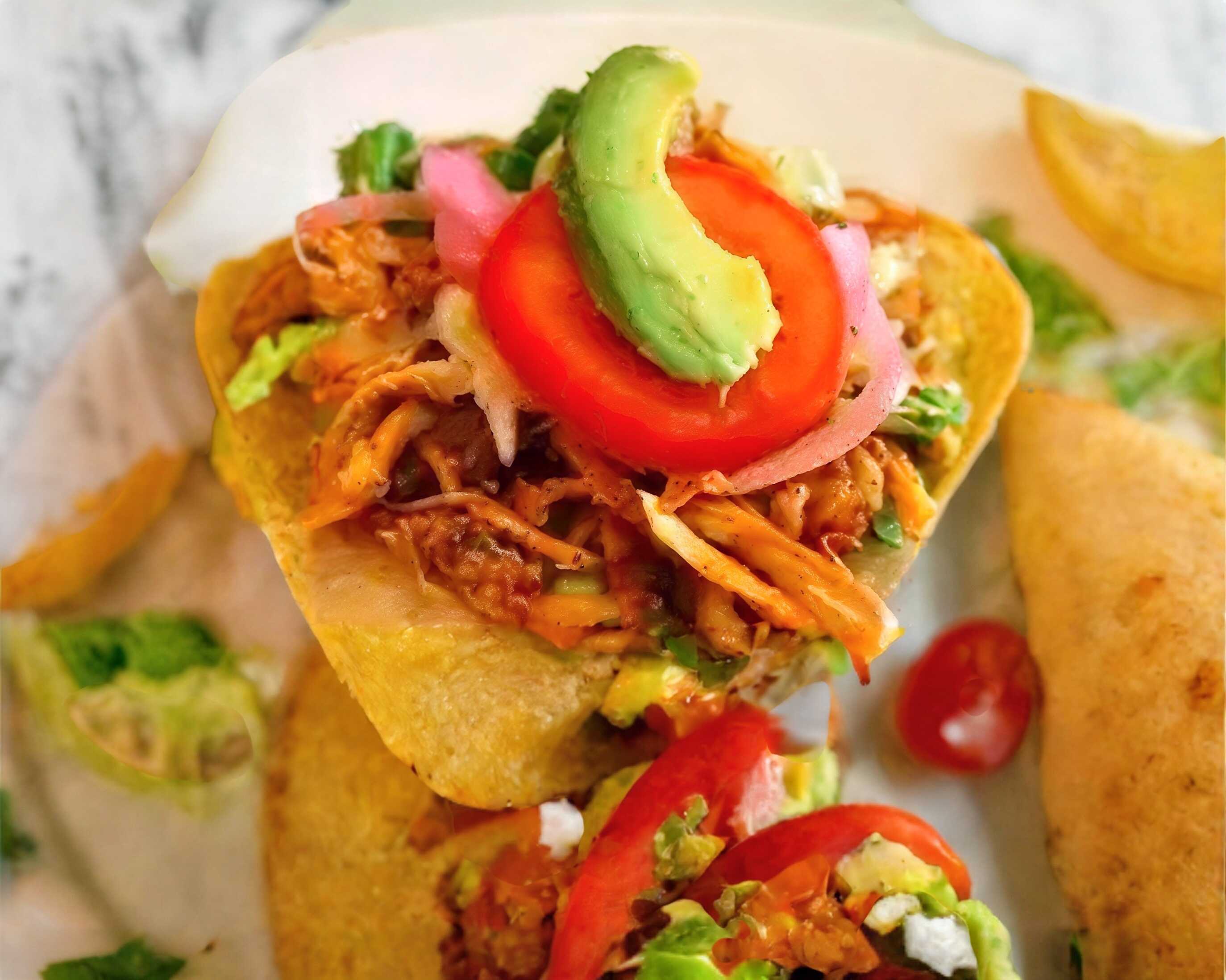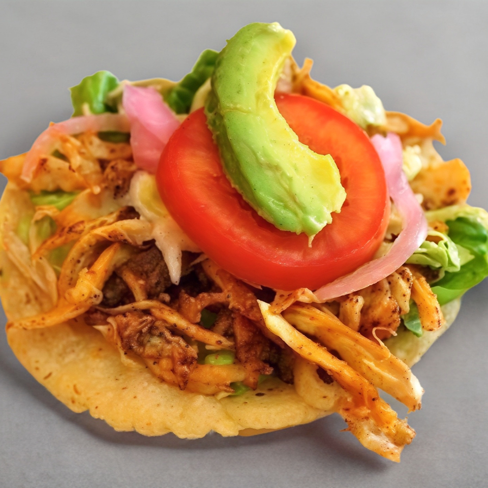 Deliciosa tortilla rellena de frijol colado frita con carne molida, lechuga, tomate, cebolla morada curtida y aguacate.