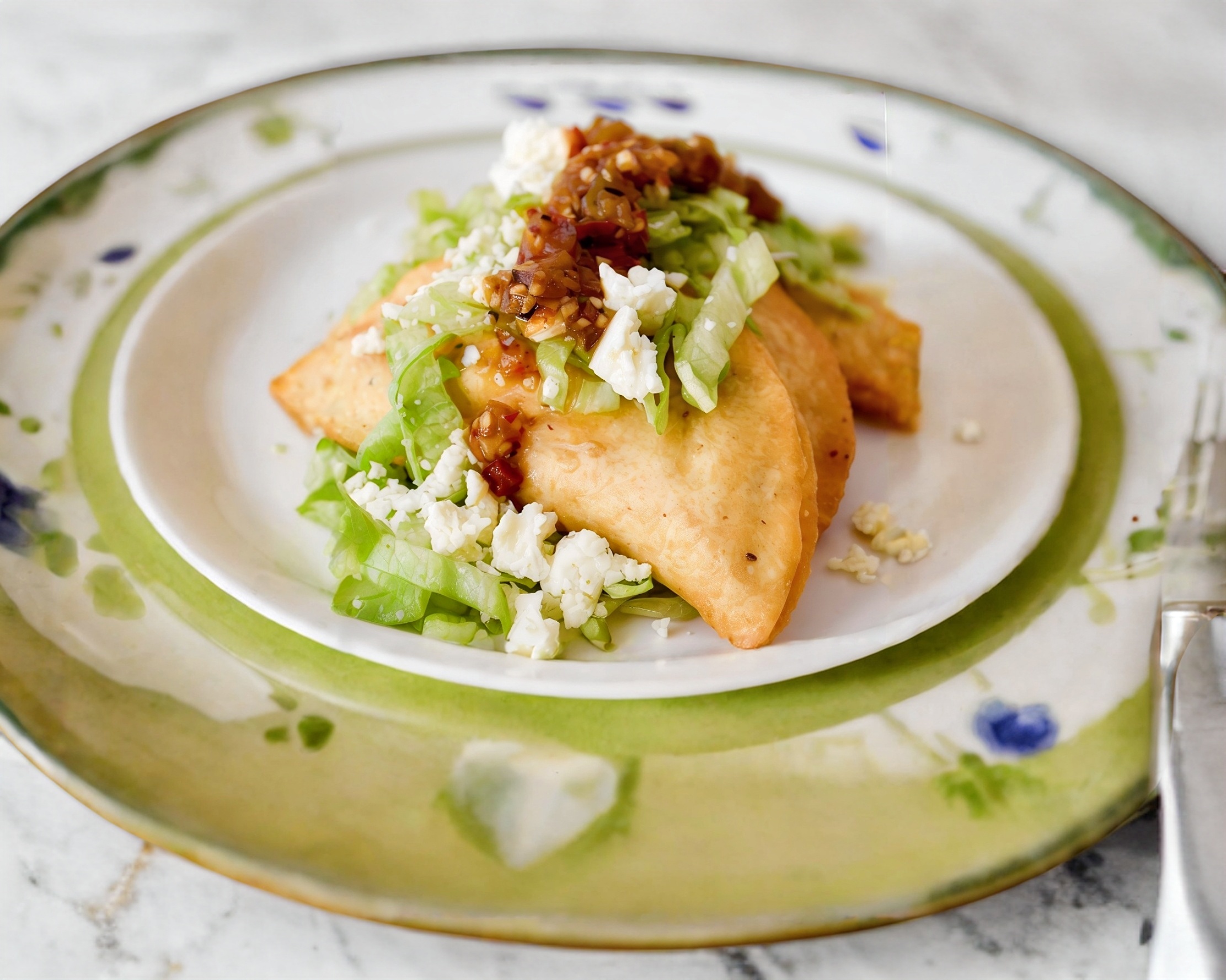 Deliciosa empanada de masa de maíz rellena con carne enchilada preparada con crema y lechuga.