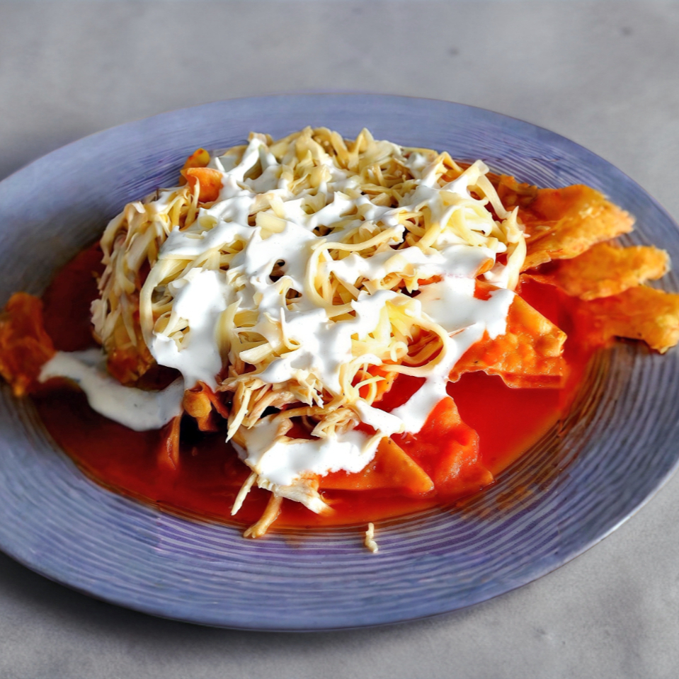 Totopos bañados en salsa roja no picante , acompañados , con crema , queso fresco y frijol refrito . Puede elejir la proteina de su eleccion ( pollo , huevo , carne enchilada y carne asada de res)
